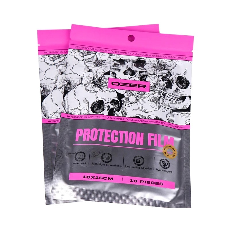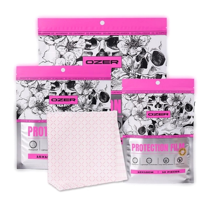 Avec des mains propres ou des gants, découpez le film OZER à la taille souhaitée, en laissant environ 2 à 3 cm de marge autour du tatouage.