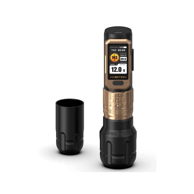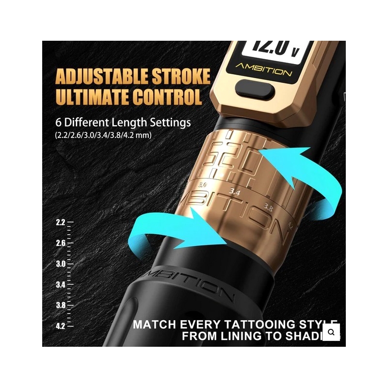 Particularité du dermographe : si la batterie est déchargée, vous pouvez soit la recharger soit travailler avec une alimentation classique grâce à son embout spécifique inclus dans le coffret !