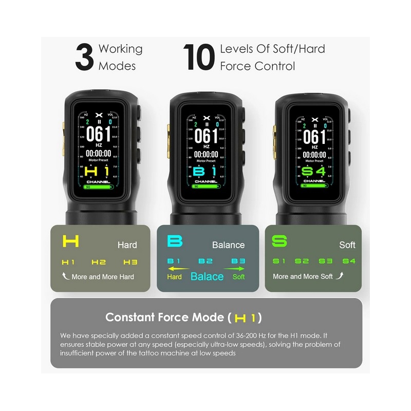 Son système unique propose trois modes de travail parfaitement calibrés pour s’adapter à tous les styles et à toutes les peaux : le mode Soft (S1 à S4) idéal pour les zones sensibles et les aplats délicats, le mode Balance (B1 à B3) pour un rendu stable et polyvalent, et le mode Hard (H1 à H3) offrant un impact ferme, une pénétration accrue et une absorption optimale du pigment. Le mode Constant Force H1, doté d’un contrôle de vitesse constant de 36 à 200 Hz, garantit une puissance parfaitement stable même à très basse vitesse, éliminant le manque de force que l’on retrouve souvent sur d’autres machines.