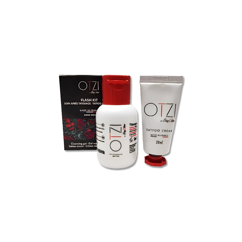 Découvrez le Kit Tattoo Flash OTZI, le duo indispensable pour protéger, hydrater et sublimer votre tatouage dès la première séance.